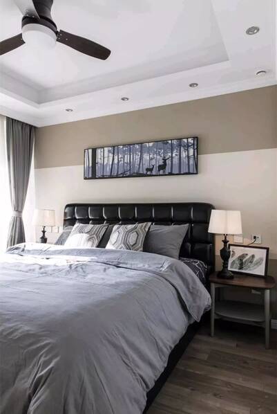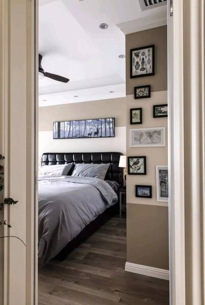 主卧的床头靠垫是黑色皮艺的,床头挂一幅林中小鹿装饰画,而卧室开门对着的这面墙则挂满了装饰画,整体空间显得格外的创意舒适。